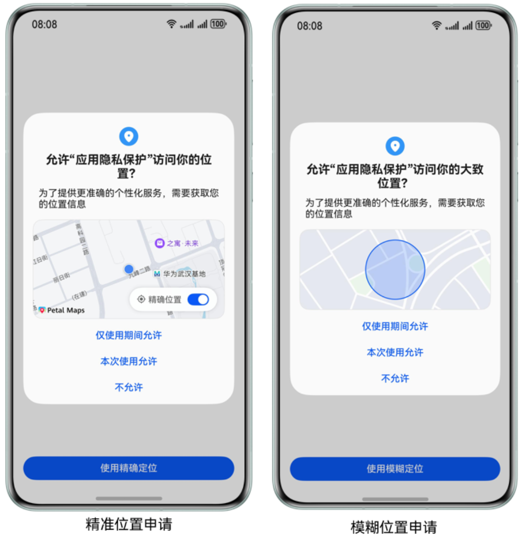 在API9以后,当应用同时申请 ohos.permission.APPROXIMATELY_LOCATION 和 ohos.permission.LOCATION 权限时,可以获取用户精准位置,精准度达到米级。如果应用仅申请 ohos.permission.APPROXIMATELY_LOCATION 权限,权限弹框仅显示模糊位置权限。