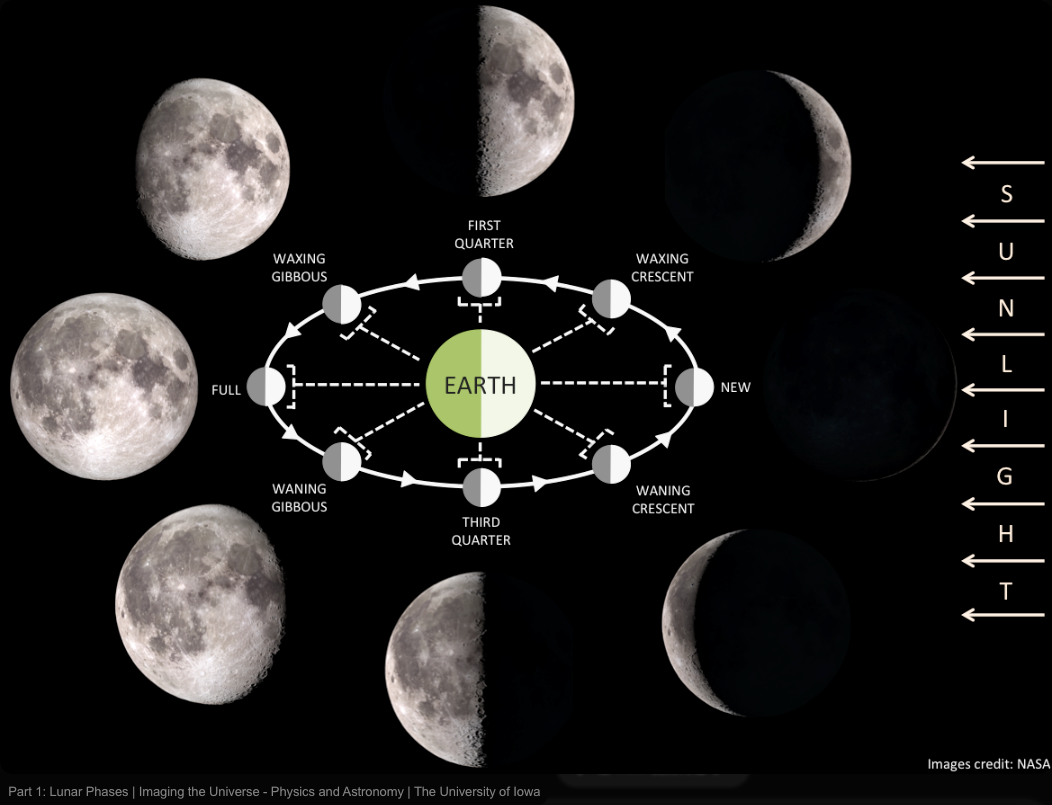 科普图里,光线是朝一个方向射来的,这有利于理解“地月日“三者的几何关系造成月相的变化。但是,地球是在带着月球一起绕太阳公转的。当地球在轨道上走了一个月,它相对于太阳的方向已经改变了约30度(360° ÷ 12个月 ≈ 30°/月)。等于一个月(恒星月)后,你用来科普的这张图片里,光线已经偏了30°,即你今天看到的月相与一个月前肯定是不一样的,还得再过两天,光线又恢复了当初的角度,才能呈现跟一个月前一样的月相。