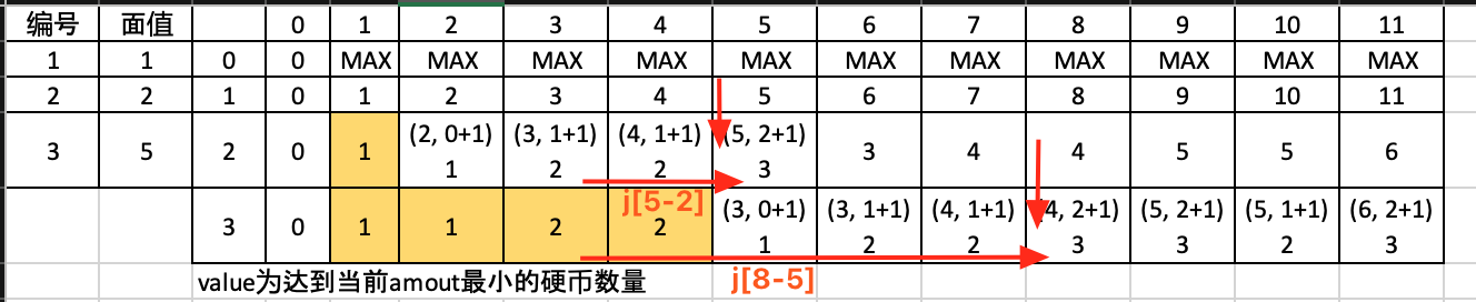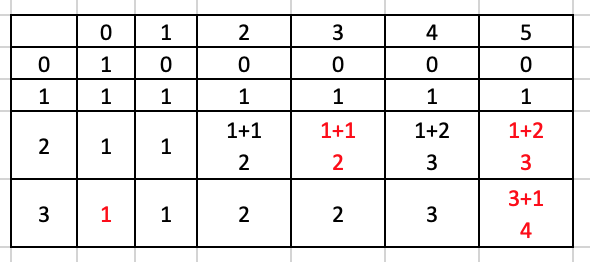 - 初始值有变化, 没有硬币时兑换方式为0(即第一行是0); 金额为0时总有一种兑换方式(即0个硬币), 所以第一列是1