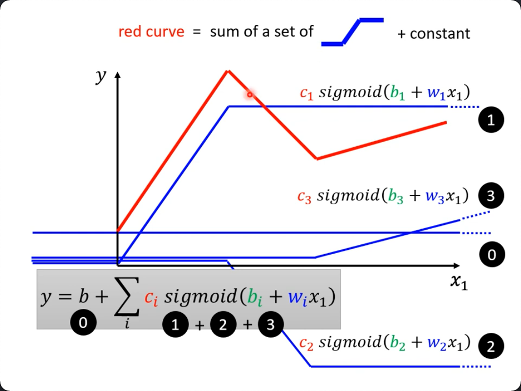 但是如果是纯曲线,那么其实是可以无数个sigmoid来组合的,就不存在要去拟合某些“特定的点”,那样只要找到最合适“数量”的sigmoig就行了(因为任何一个点都可以算是折点)