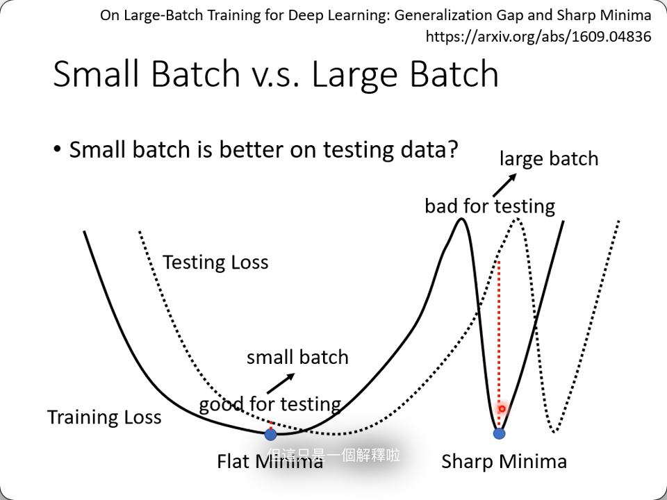 两个local minimal,右边那个认为是不好的,因为它只要有一点偏差,与真值就会有巨大的差异。但是没懂为什么大的batch会更容易落在右边。