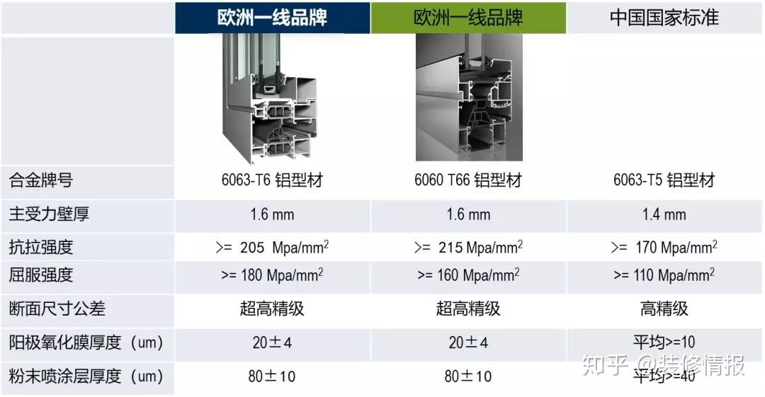 下表选取国际一线品牌系统窗与普通窗的铝合金要求: