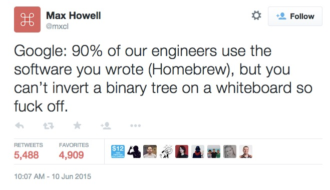 最近在找工作,所以这些算法梗又出现在了我的阅读视野里,比如经典的homebrew作者吐槽的翻转二叉树的问题。