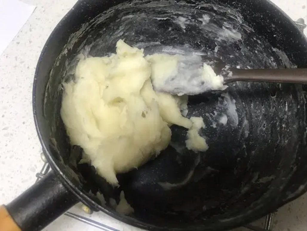 把汤种用的高筋粉和水混合,搅至没有粉疙瘩,然后小火加热,不断搅拌,直到变得粘稠,放凉后备用
