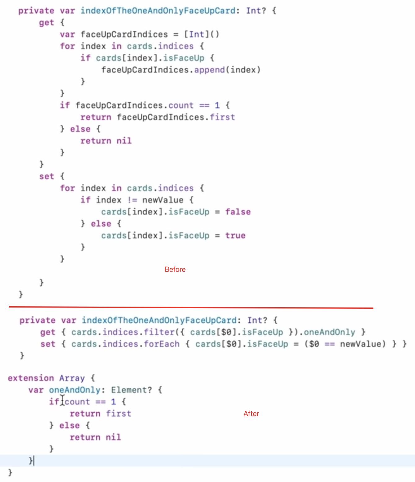 typealias Card = MemoryGame<String>.Card别名var a_int_array = [Int]()一种初始化方式- extension中的属性可以直接用,(当然也可以用