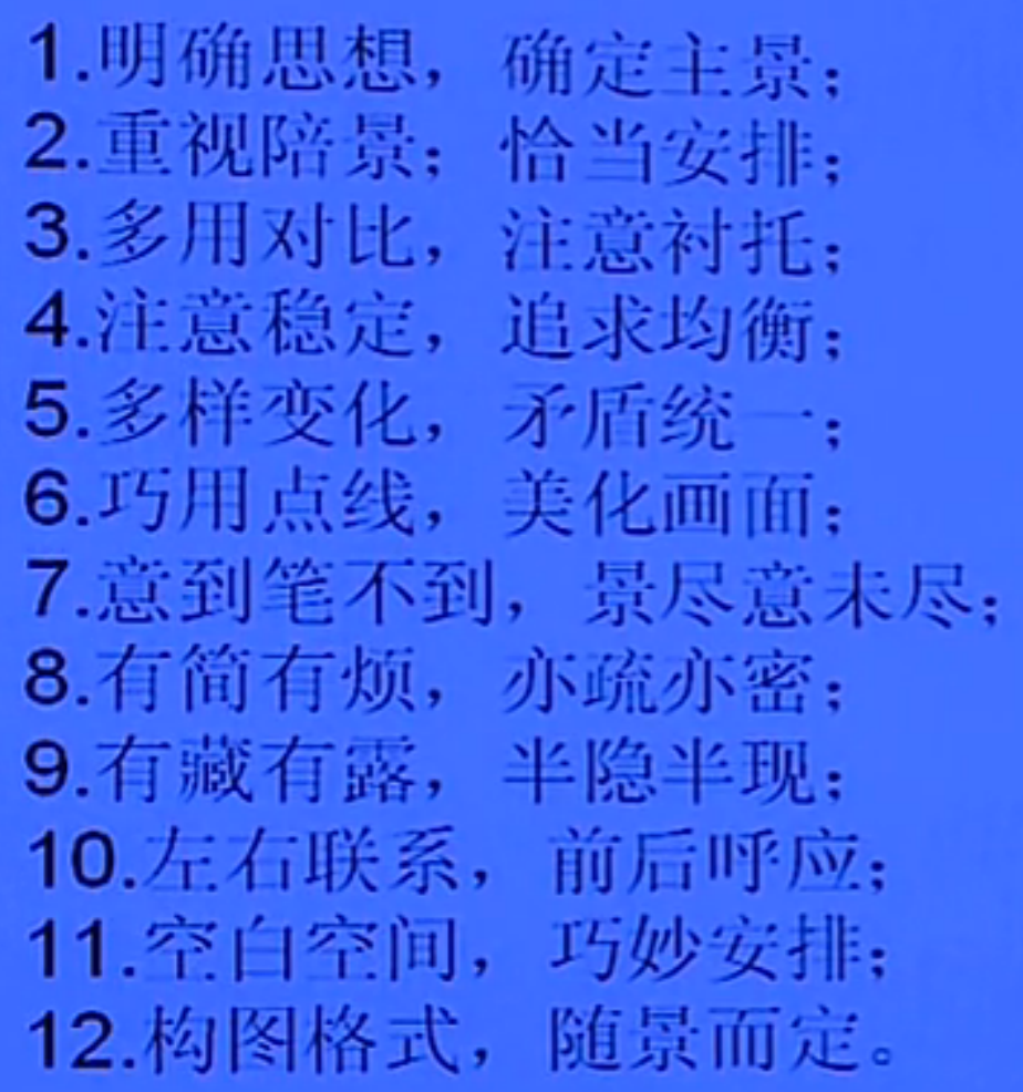 - 近大远小(线条透视), 近暗远明(大气透视),