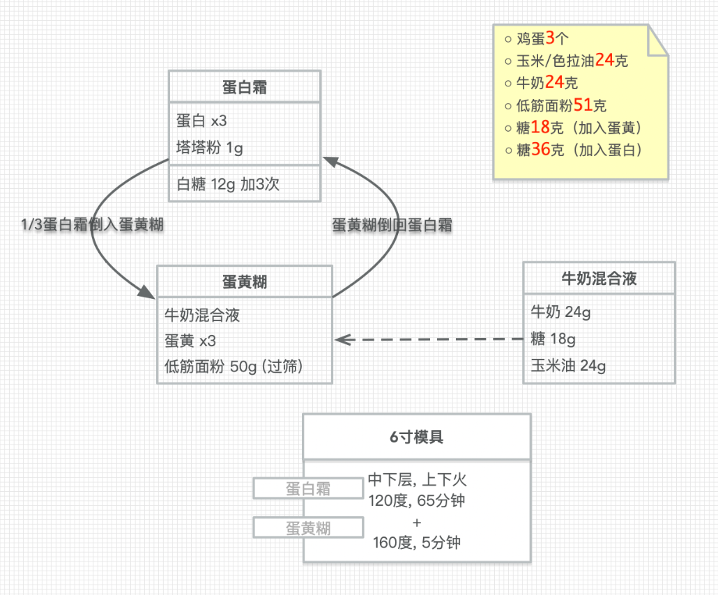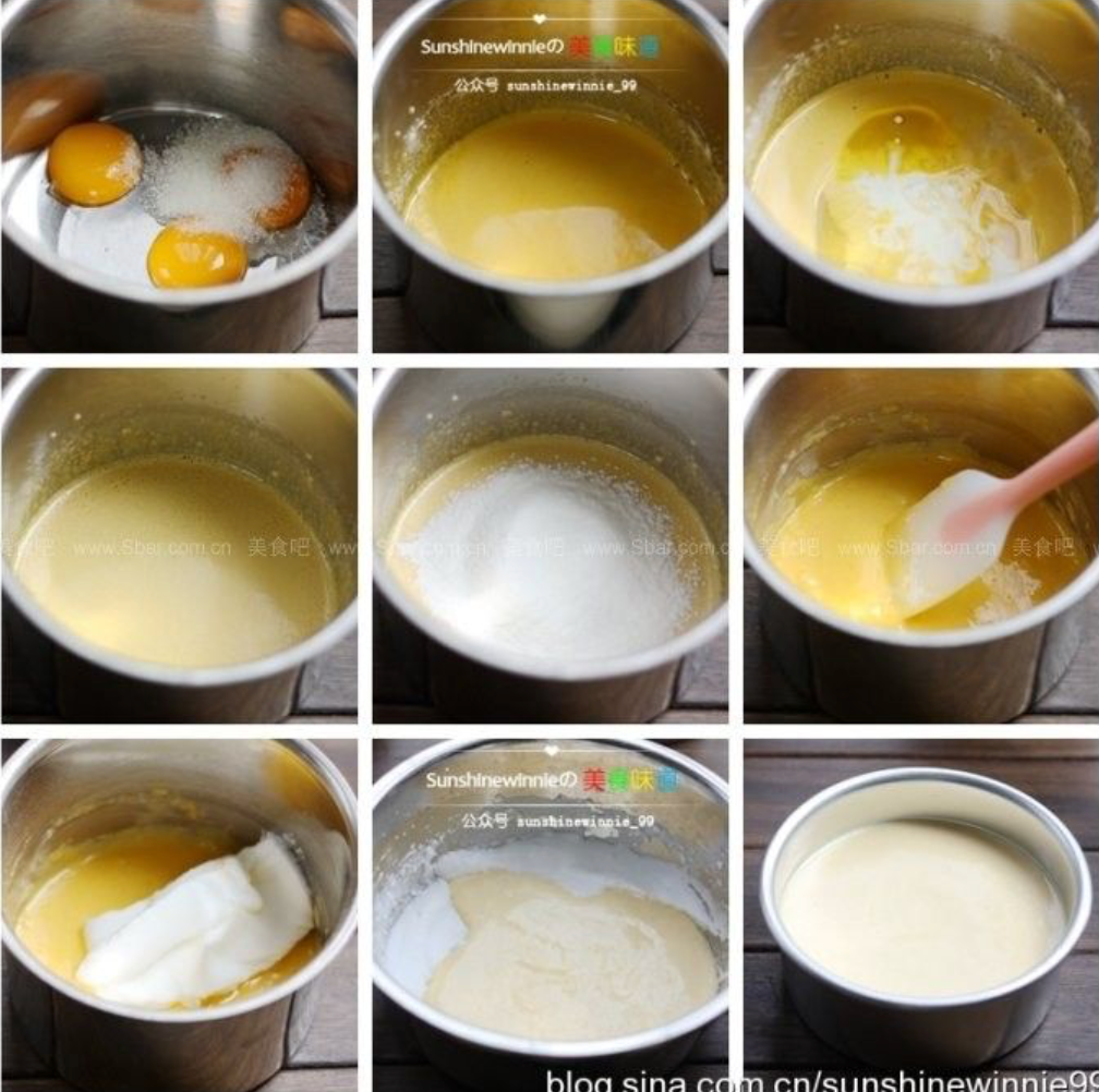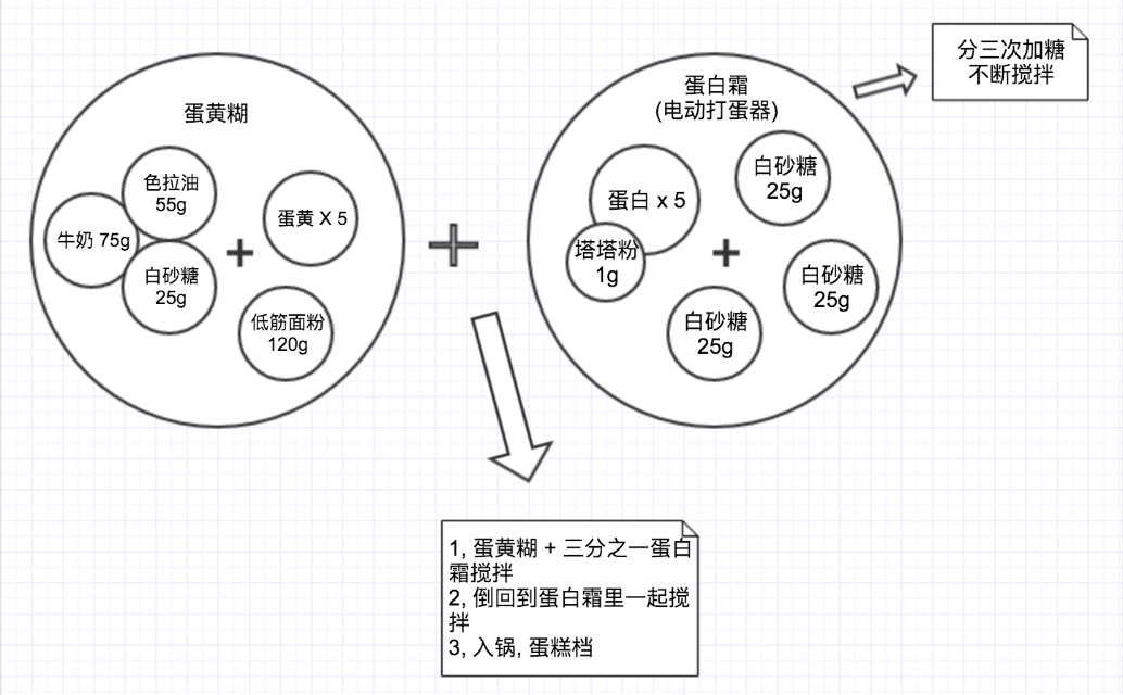 - 搅拌蛋白+蛋黄用fold in法, 就是翻炒, 不要画圈(以免蛋白消泡)