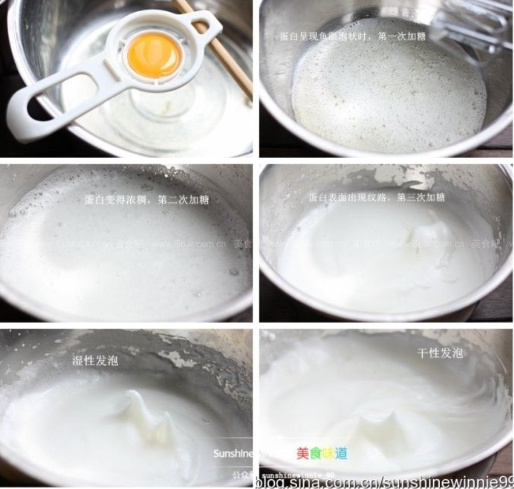 - 然后在打的过程中分三次加入糖(盐混合在糖中),继续用电动打蛋器打至干性发泡(提起打蛋器能看见坚挺的小尖尖状)