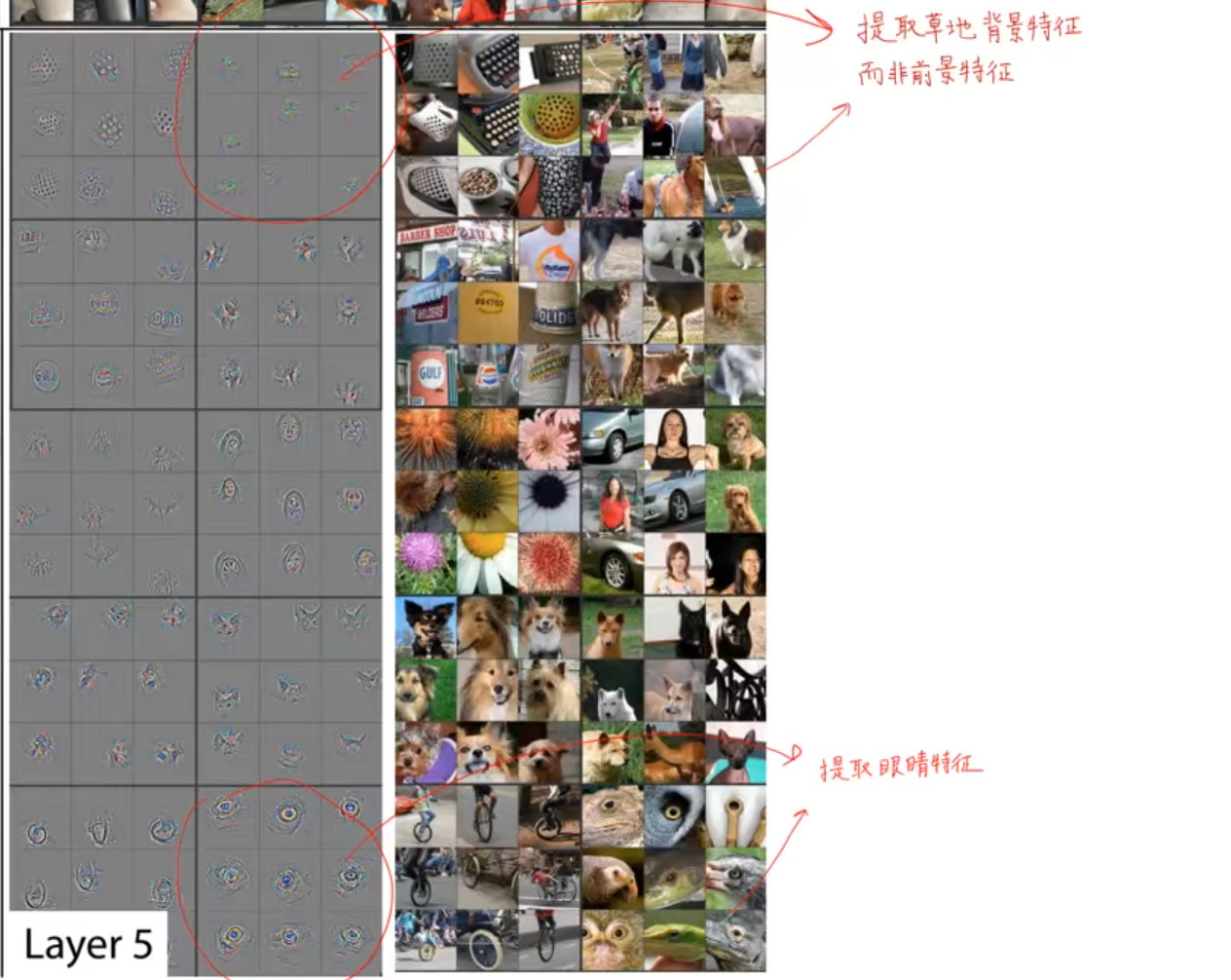 到了第5层,可以看到能找出的原图已经不像前几层那么“几乎一样”了,说明它提取的特征已经很高级了,比如圈出来的几项,有的提取了草地,有的提取了眼睛,而不管图片是不是从像素的颜色分布是不是基本一致了。
