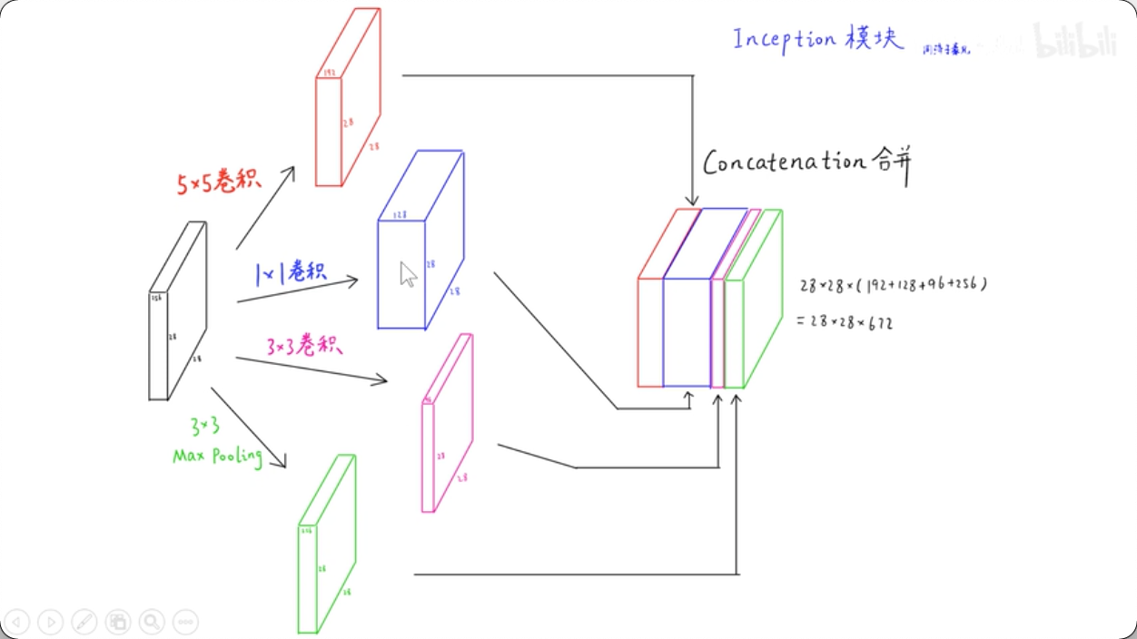 几个平行卷积成相同大小但不同厚度的张量(5x5, 1x1, 3x3, 3x3pool)->(192, 128, 96, 256),叠起来,叫一个Inception模块,传到下一层