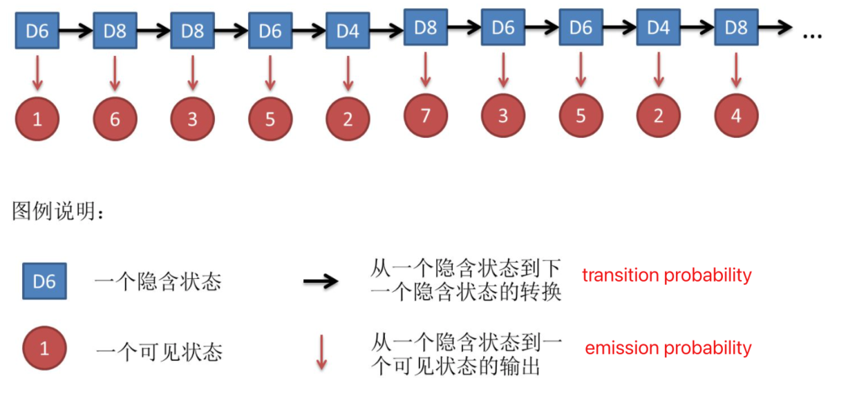 emission probability):隐含状态和可见状态之间的概率,比如D4下1的概率为1/4,D6下为1/6 (表现概率,激发概率,多种翻译)