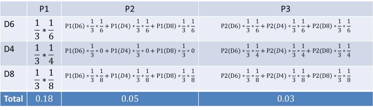 - 1,6,3 => P3(D4) = P2(D6) P(3|D4) P(D4) =